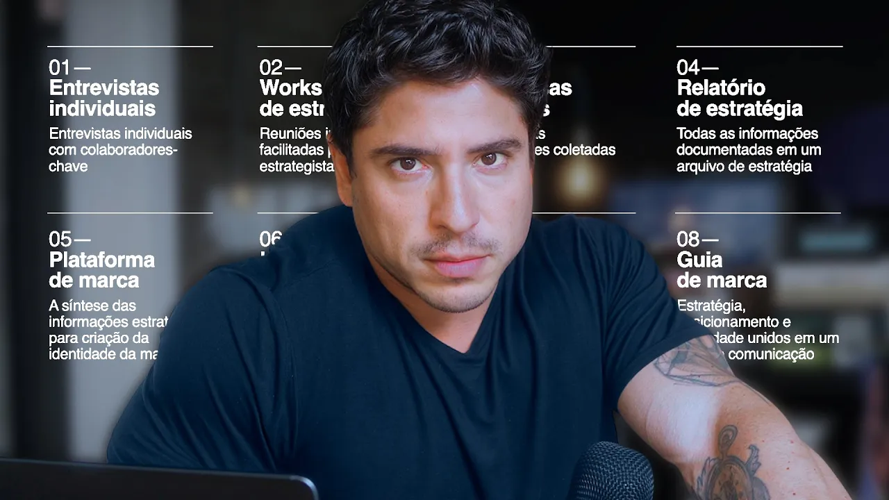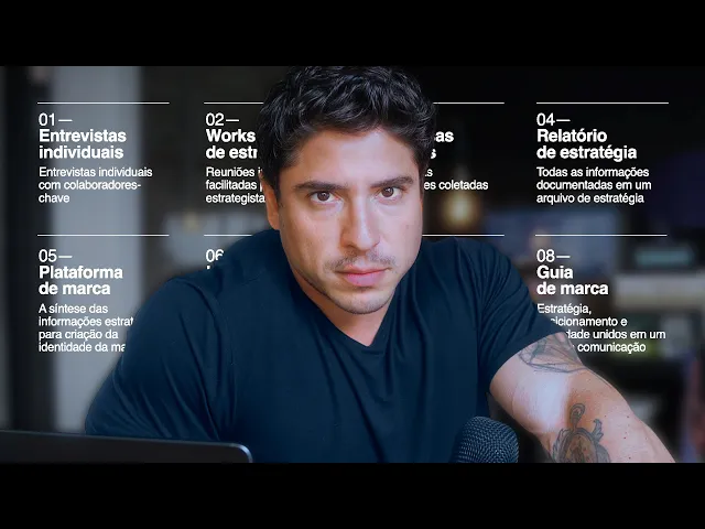 processo para apresentar para ele e eu quando você tem um processo você é capaz de dizer para o cliente o que que vai acontecer em cada etapa sabe aquele negócio que normalmente o designer faz de assim: "Ah o projeto do designer ele pega o seguinte ele ele ele começa ali a trabalhar o cliente aí ele tem uma uma fase inicial ali onde ele faz briefing pega algumas respostas tal não sei o quê e depois ele some fala: "Não agora eu vou criar" aí o maluco vira um vampiro vai pra caverna entra no sarcófago ali e