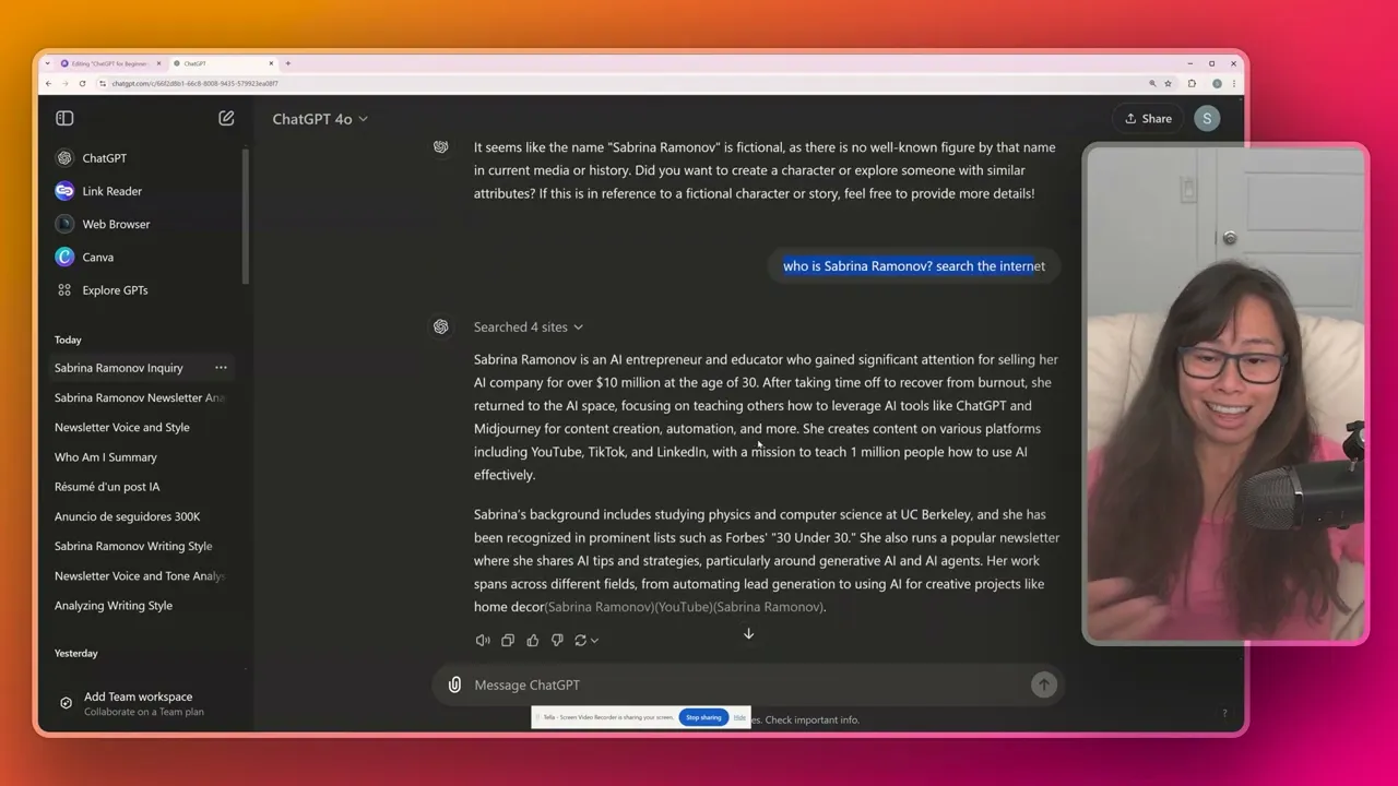 enter chat GPT responds it seems like Sabrina is a fictional character there is no well-known figure by that name in current Media or history now what I'm going to do is submit the exact same prompt except I'm going to say search the internet now it's searching the web you can see the steps it's taking here right it's search Sabrina ROV at bing.com it found my newsletter sabrina. deev it found my YouTube channel it found my bio which is hosted on my newsletter okay now it replied like I'm no longer a fictional character and it's pulling