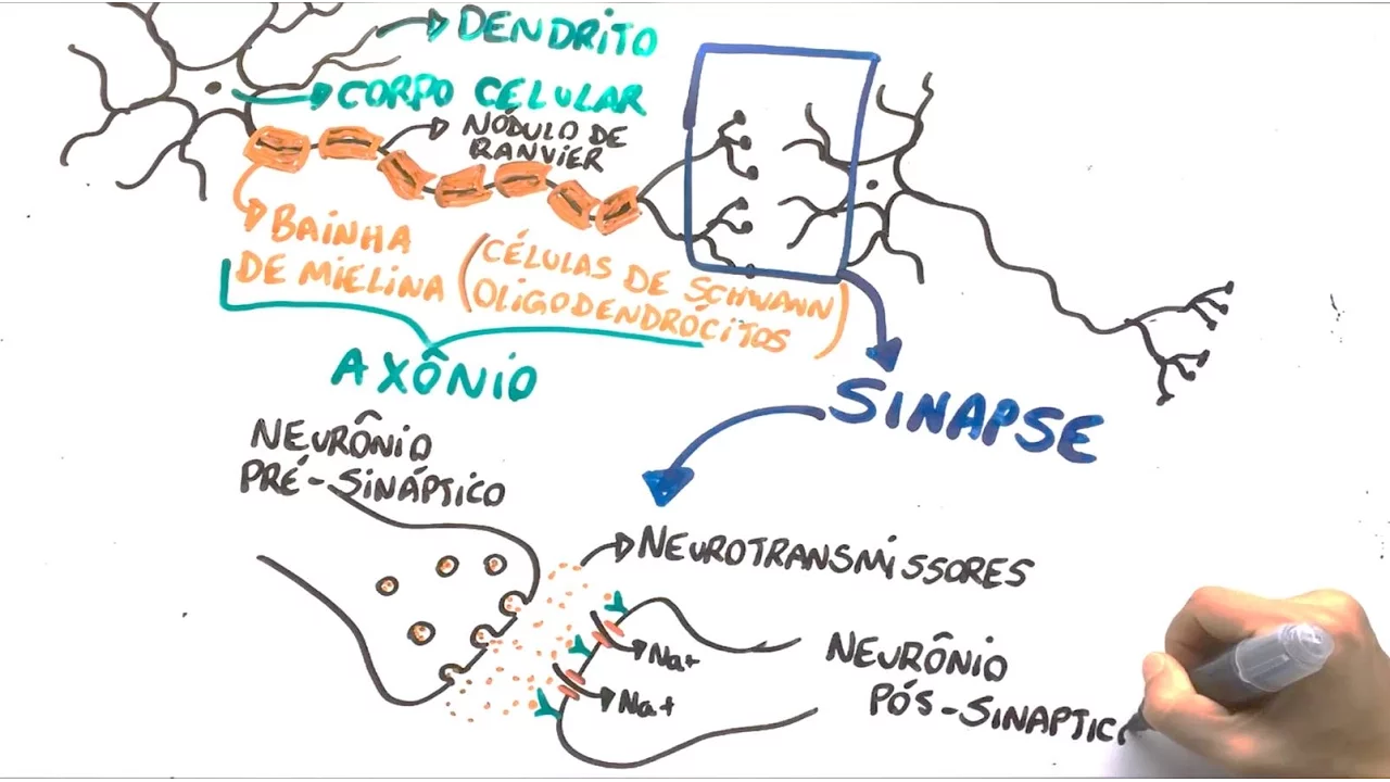 [Música] Fala galera beleza bem-vindos ao primeiro vídeo totalmente explicativo do canal e o assunto escolhido foi neurônio e condução do impulso nervoso Lembrando que o neurone é a principal célula do sistema nervoso ela é formado por três partes que são os dendritos que estão que é o termino de recepção captação dos estímulos o corpo celular que é Onde encontramos núcleo e as demais organelas e o axônio que é essa cauda do neurônio né Lembrando que a maioria dos neurônios possui o axônio envolto por uma camadinha de gordura chamada bainha de Melina que nada mais é
