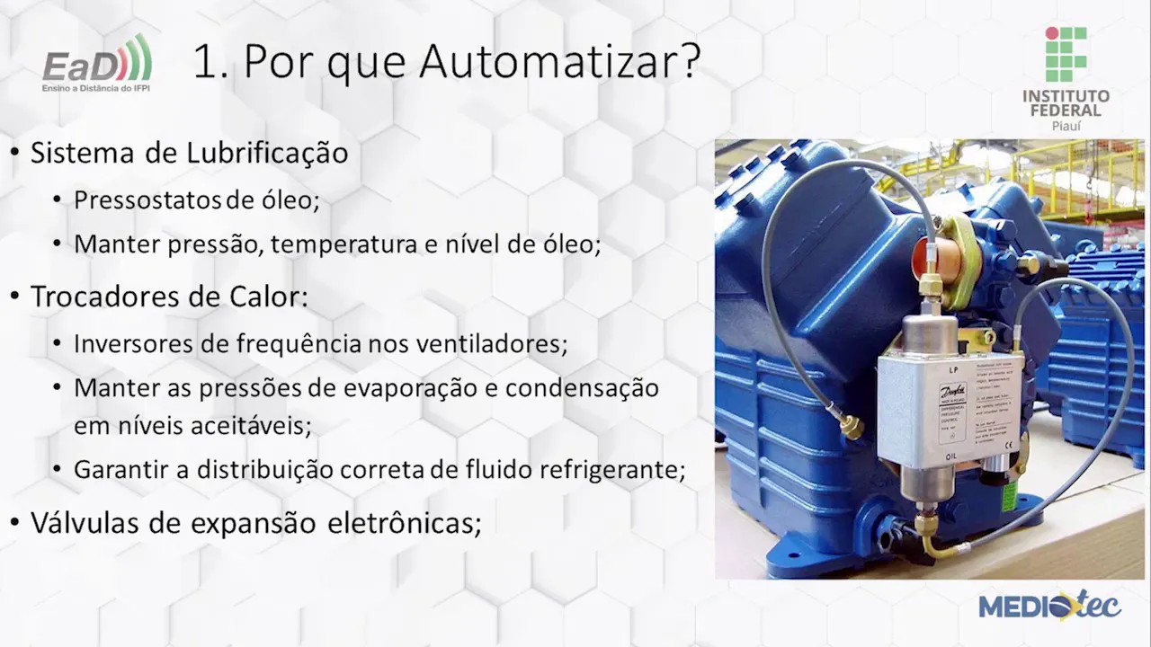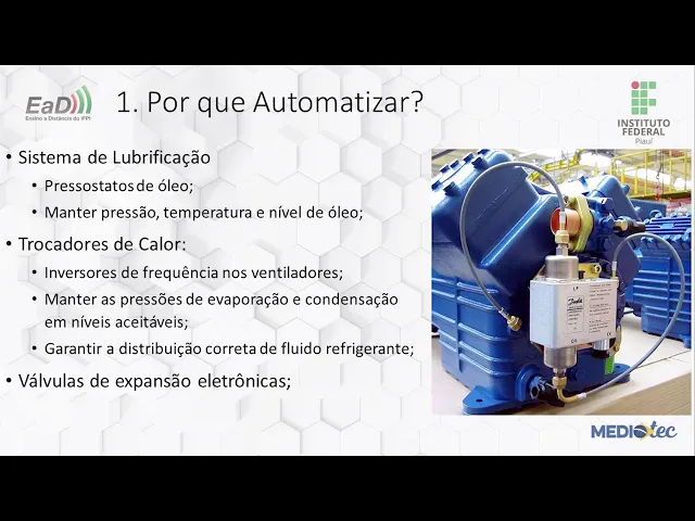 [Música] [Música] olá pessoal aqui é o pro santos são fortes e vamos iniciar disciplina de automação do curso técnico em refrigeração do médio tech instituto federal do piauí modalidade ead nessa primeira unidade a gente vai entender um pouco sobre os motivos que levam à automação os controladores eletrônicos que têm sido aplicados na refrigeração e também entender um pouco de algumas técnicas de controle de capacidade no compressor bem então é a automação ela vem pra que ela vem pra melhorar as técnicas de controle garantir é que os ambientes estejam na temperatura correta garantia as melhores condições