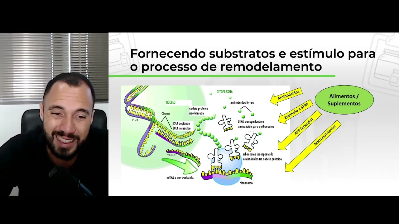 remodelamento ou é potencializando o processo de remodelamento vamos entender o primeiro processo é favorecendo o processo de de remodelamento é fornecendo substrato e estímulo para o processo de remodelamento Por exemplo quando você toma uma whe Protein um suplemento proteico ou quando você toma aminoácidos essenciais Albumina caseína n hiperproteico você está fornecendo aminoácidos para que esses aminoácidos sejam utilizados para síntese de novas proteínas Você também está fornecendo aminoácidos que vão ter leucina que vão estimular a síntese proteica muscular estimular diretamente a leucina estimula estimula o processo de tradução que envolve aqui ó tradução na verdade transcrição