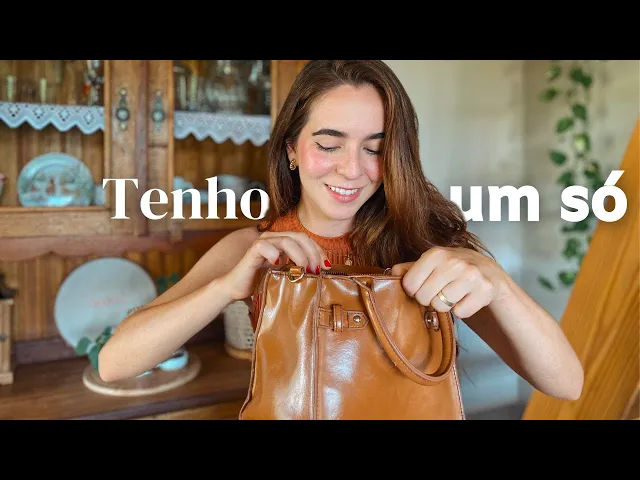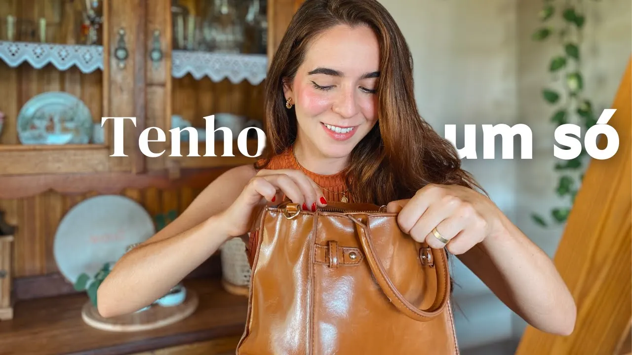 em alto o que está na moda quando a gente entende verdadeiramente isso a nossa vida ela fica muito mais leve e eu gostaria de compartilhar os sete itens que eu tenho apenas um hoje em dia e eu coloquei aqui na mesa para mostrar para vocês né o primeiro item é bolsa Essa é a minha bolsa de sair por sinal gente ela tá bem desgastada vocês provavelmente estão ouvindo um leve ruído de fundo que é a geladeira que começou a fazer o barulho dela ela adora aparecer no vídeo tá gente então vamos focar no conteúdo aqui