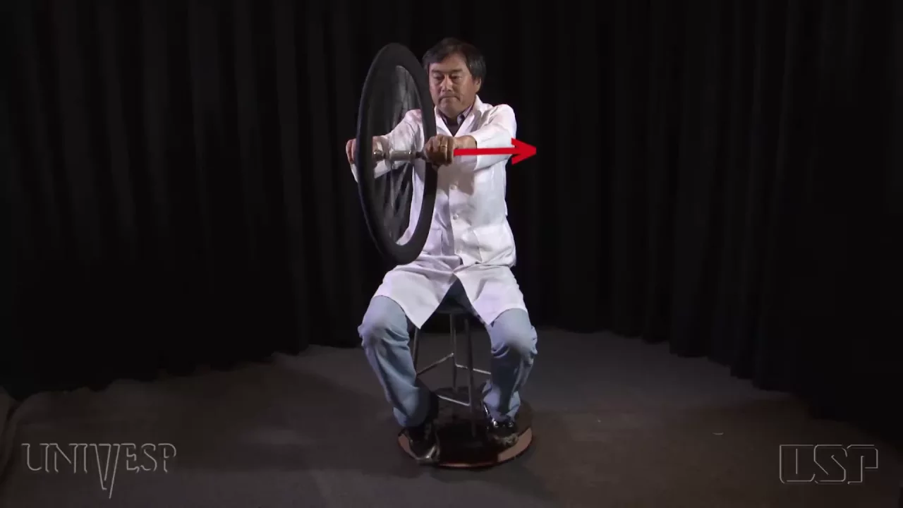 neste experimento usaremos uma banqueta sobre uma plataforma giratória e uma roda de bicicleta girarem a roda de bicicleta e sentaremos Na banqueta segurando o eixo da roda Quando mudamos o eixo de rotação da roda de bicicleta da posição para posição horizontal notamos que todo conjunto sobre a banqueta passa a girar no sentido contrário ao sentido de rotação da roda voltar posição o conunto para dear se inmos a posição horizont Doo da roda o conjunto também passará aar no sentido Rod da bicia ela adquire Momento Angular que é uma grandeza vetorial com módulo direção e sentido