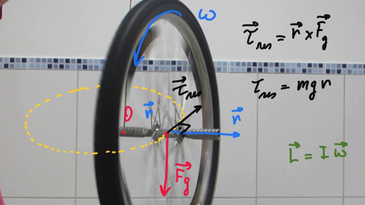 conjunto é muito maior comparado com o momento de inércia da roda o mesmo efeito Pode ser observado quando seguramos a roda girante em apenas uma das pontas do eixo e a posicionamos em cima da cabeça neste caso também para conservar o Momento Angular o conjunto todo passa a girar no sentido contrário à rotação da roda da bicicleta n