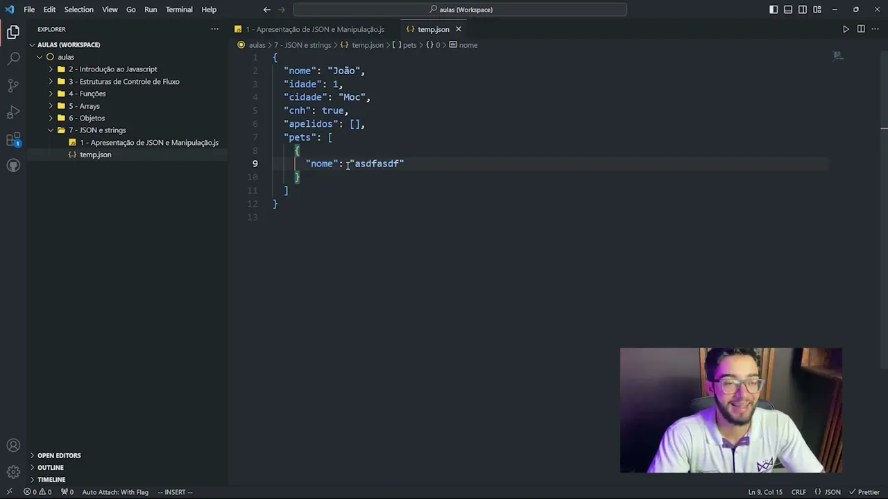 e que no final a gente consegue pegar um objeto JavaScript e transformar ele em uma string né um texto e enviar esse texto para outro dispositivo esse outro dispositivo pega essa string interpreta ela e Transform forma de volta em um objeto tá então é isso que nós vamos ver nessa aula aqui tá então eh eu criei aqui né o novo módulo o novo arquivo para exemplo dessa aula mas para iniciar aqui eu vou criar um novo arquivo aqui esse arquivo ele vai ser temporário né então eu vou chamar aqui de temp P Jason tá eu