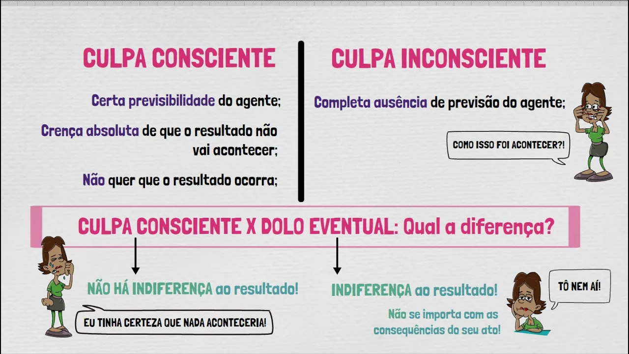 conduta e não se importa com as possíveis consequências de seu ato ao contrário na culpa consciente o agente não quer e nem é indiferente ao resultado mas acredita fielmente que nada acontecerá para saber mais sobre teoria geral do crime clique nos vídeos que selecionei para você se essa aula facilitou o seu aprendizado Não deixe de se inscrever no nosso canal e deixar aqui o seu like e o seu comentário