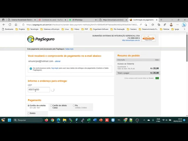 deseja fazer o pagamento ele vai mostrar as informações necessárias para poder Então você fazer a sua escolha a forma de pagamento Lembrando que o sistema ele não você não esse valor não vai dar certo para você no caso acessar outra licitação Então você tá pagando para acessar a única situação agora você vai entrar aqui né número de um certo letra solicitado você vai preencher essas informações aqui da rua número né E aqui embaixo você tem aqui os pagamentos com como você queira então fazer escolha da sua forma de pagamento cartão de crédito o pix né