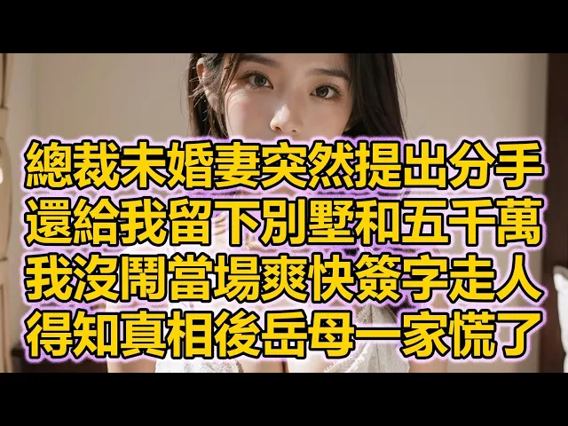 總裁未婚妻突然提出分手,還給我留下別墅和五千萬,我沒鬧當場爽快簽字走人,得知真相後岳母一家慌了