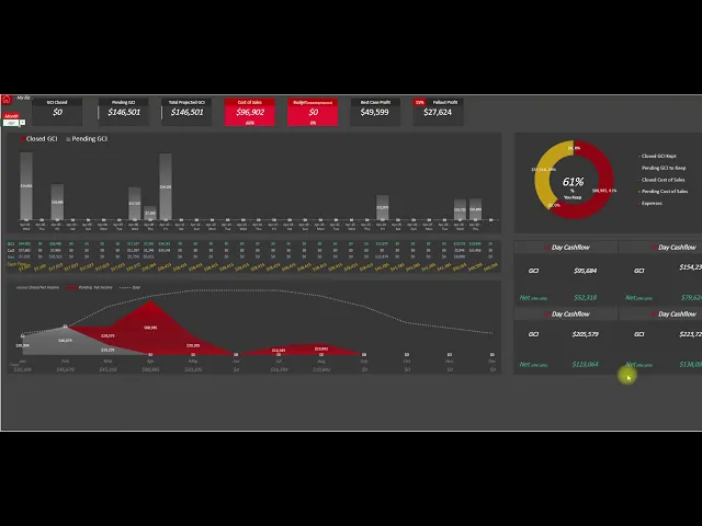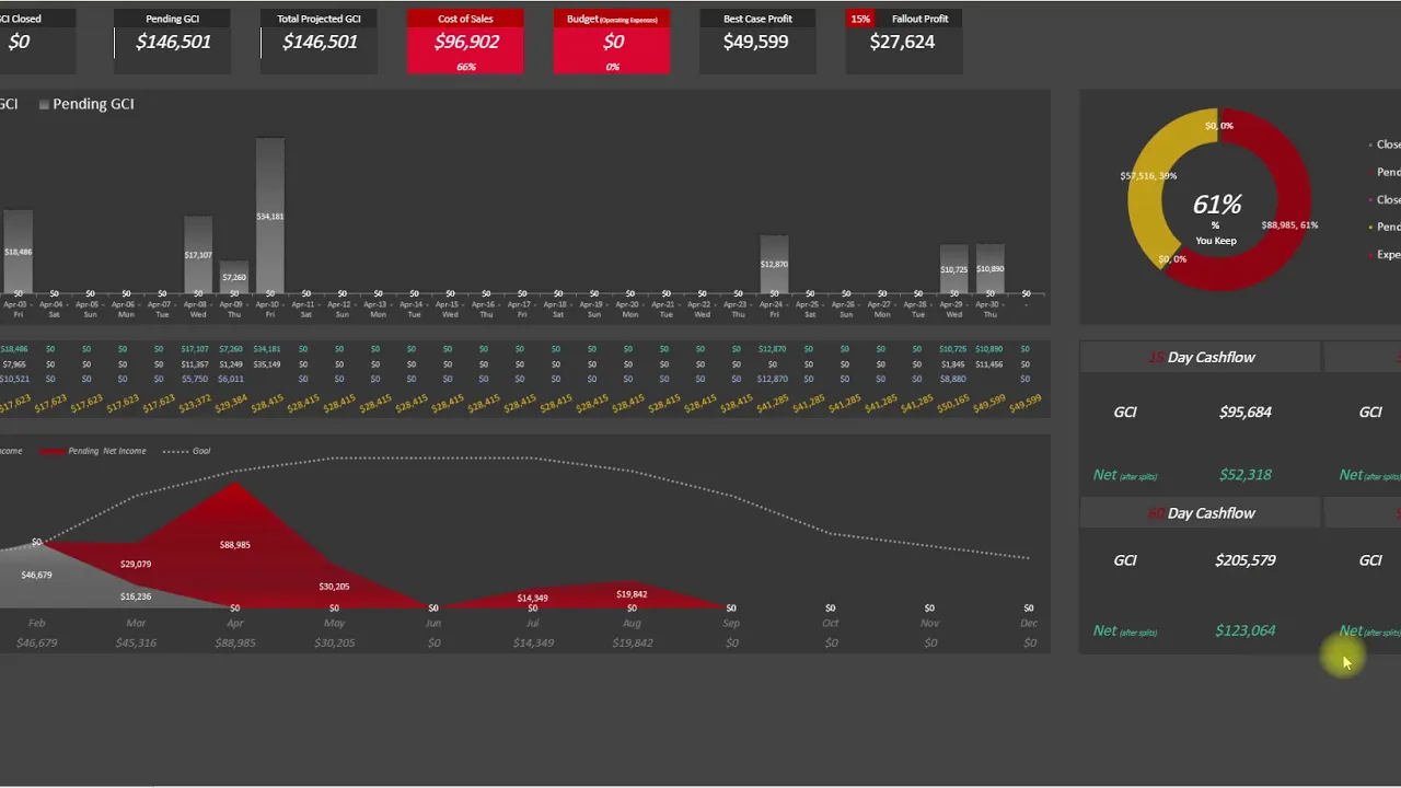 gonna go in there and grab all of your data you can see your cash flow day by day for any month of the year it also shows the entire months down here at the bottom as well so red is still pending to close so we can see that it gives me 15 30 60 90 day cash flow reports over here but then it also gives you that daily cash flow so if you're looking at certain bills you guys are looking at maybe holding back on or paying you guys can see what's coming in and not
