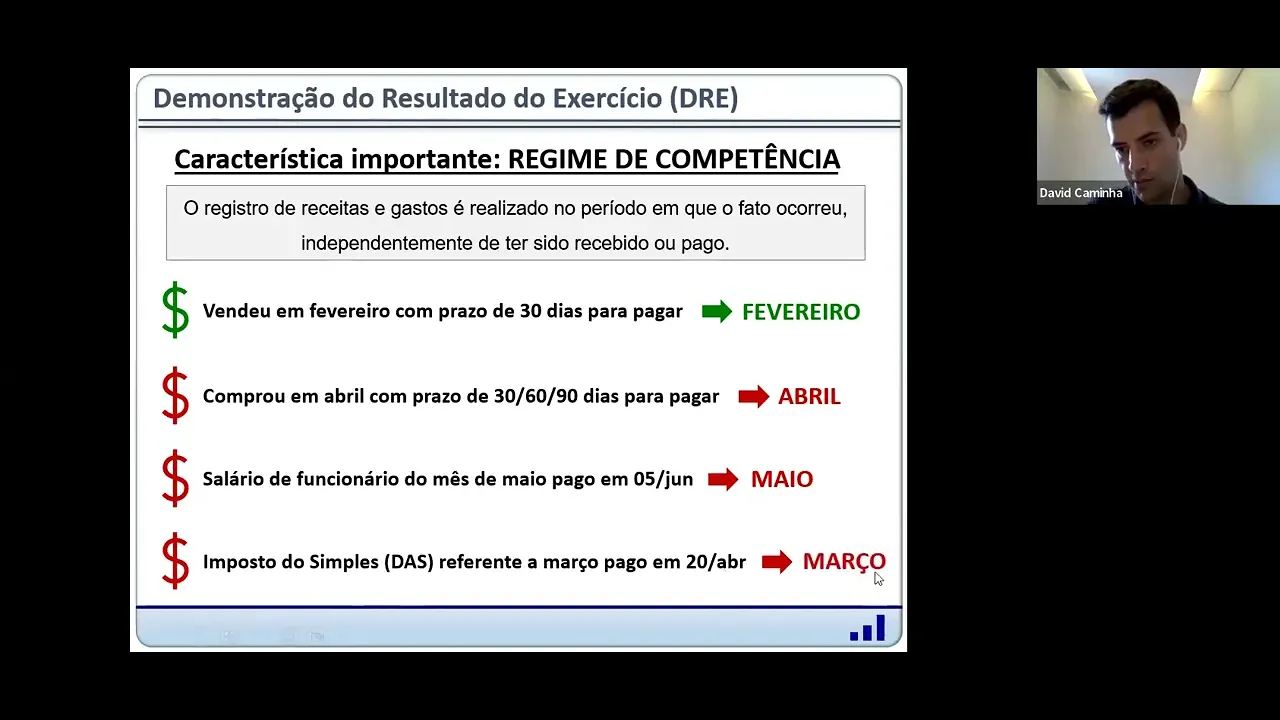 aparecer que esse mês ele foi muito ruim porque ele comprou entrou uma despesa alta esse mês então vou fechar o resultado do Meio daquela assim nossa foi ruim para caramba esse mês entrou essa despesa alta não tive nada de venda e o mês que vem vai acontecer ao contrário vai ter um monte de venda vai ter um faturamento alto você não tem custo nenhum porque esse curso já ficou lá atrás Então você fica um resultado que não reflete de fato o que é então a Gente precisa isolar cada um dos períodos com os gastos e