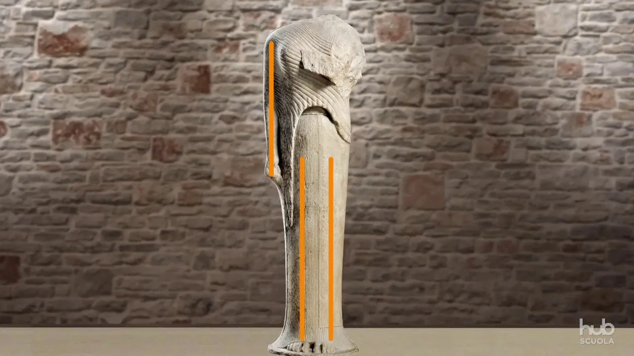 piedi e pieghe sui tessuti che testimoniano una ricerca più avanzata da parte dell'artista si riconoscono già nell'era di samo caratteristiche che accumuleranno molte altre cose nell'area greca del sesto secolo avanti cristo indossa alcuni capi di abbigliamento ben riconoscibili il keaton e una lunga tunica stretta sulla vita lima tion un mantello che le copre la spalla destra e un ep blè ma un altro manto che le scivola lungo il dorso e si raccorda la cintura sul lato frontale la postura in piedi con le gambe allineate il braccio destro segue l'andamento della gamba mentre il sinistro è