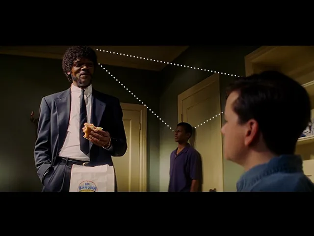 by wondering why Jules and Vincent are there and what what I love about this scene is that the usual rule is start late leave early but here Tarantino flips that on its head hey keep chilling when Vincent and Jules enter the room Jules positions himself in the center with the light hits the strongest right in the middle of the shot and he makes this not so subtle but Unforgettable gesture making it clear who's in charge that's why he's positioned in the most dominant part of the frame because the whole scene is about a display of