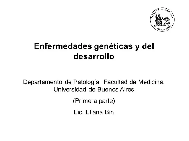 hola a todos mi nombre es eliana bin soy docente del departamento de patología y vamos a hablar de enfermedades genéticas y el desarrollo la clase va a estar dividida en dos partes en esta primera parte hablaremos sobre las características generales de estos trastornos la clasificación y algunos patrones de herencia y en la segunda parte hablaremos sobre trastornos cromosómicos y tipos de herencia no clásica cuando hablamos de enfermedades genéticas nos referimos a anormalidades genotípicas que permiten el desarrollo de un embrión y que presentan manifestaciones a nivel genotípico alteraciones genéticas pueden tener diferente grado de afectación en