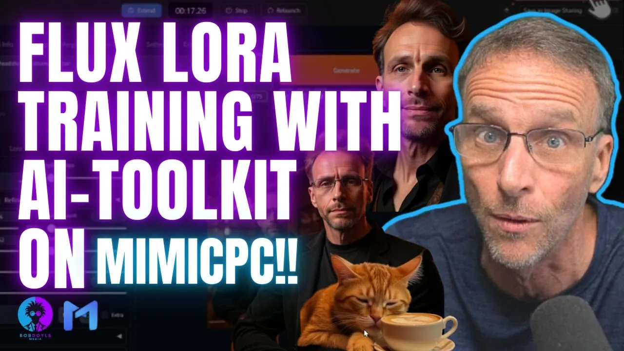 if you're an AI art generation geek like myself then you've been watching the flux model I'm sure with great appreciation as we all have even despite some of its little shortcomings here and there and you know what's really hot right now is getting your own face into these things via lauras stands for low rank adaptation and it's just a way for you to tweak an existing model to include your information in there whether it's your face or whether it's your cat or your friend's face or an object or a style it doesn't matter you can use luras to customize the flux models if you have the tools tools and know how now if you're like me you've looked at a bunch of videos about how to do that and you've seen all sorts of solutions some run locally and those videos will take you about an hour to get through when they talk about how to install all the software and oh make sure you have the right GPU and all that other stuff and even the ones that talk about how to set up various softwares on remote servers it's still a process to go through I'd like to share way with you that you can create a custom Laura in about an hour for about $119 cents over at mimic PC you don't have to run your own GPU and in fact you can train multiple lauras at once hey it's not your computer it's not your system it's not your resources being eaten up I've tried several of these Solutions myself including ones that I've installed locally cuz I'm a geek that way but man oh man it just took up a ton of resources I couldn't do anything else on my computer and this way I'm going to show you it really truly couldn't be simpler you don't have to mess with settings or anything the default settings just as they are are going to give you great results why don't I stop talking about it and just show you this will of course require that you have an account over at mimic PC but having a mimic PC account allows you to run the latest creative AI software on another machine without having to have any experience on setting things up I've shared a couple of videos about mimic PC in the past and I'm thrilled to share that they're going to be a regular sponsor over the next few weeks so I'm going to be featuring a lot of the tools that they have here and show you how to use them especially for those of you who do not have powerful computer systems of your own but would like to get started in AI so we're going to start with the fun stuff creating custom luras of your face or a pet and showing you how to use those lauras either on mimic PC or on your own machine the most important element in any kind of training like this is the Source images they've got to be of high quality and they've got to have the right variety for the model to be able to be flexible enough to give you creative options when you go to use these models I ran several tests in preparation for this video and the first test I ran was on my face using 30 images I've used these very images like a year ago to create stable diffusion 1. 5 models and I already know what's wrong with these images but I used them anyway for this test to see what would happen but let me give you a heads up first of all you don't need 30 go with 20 make sure they are various angles various lighting various clothing various scenarios otherwise your model will be too locked in and you won't have a lot of flexibility you also want to avoid shots like this where my head is way up close to the lens and it distorts it this is another example I'm way too close this is another example I'm way too close the lens Distortion is just weird and this too too close it looks distorted what's going to happen is that the model learns that this is what my face looks like distorted so I'm going to get varied results but don't worry I learn my lesson as we go along and by the end of this video you're going to know exactly what to do but I'm telling you right now 20 images is good because I did so many models with the 1. 5 stable diffusion model are at 512 x 512 resolution and I've tested these and they work great but you can also use 1024x 1024 and of course they'll be that much better but I got to say I'm not at all disappointed with the results I'm getting with my existing 512x 512 images once you've got all your images you're ready to go to mimic PC and launch AI toolkit once you've set up an account over at mimic PC you're just going to log in and you're going to be taken to the screen where you have all of your apps now just to show you these are some of the apps that you can run here automatic 1111 is a very common stable diffusion interface for those who are interested in AI art and animation RVC is for voice cloning AMA allows you to interact with large language models it just goes on and on face Fusion for face swapping Coya SS is another model training tool fukus comfy UI chats all sorts of tools in here that you can play with without having to learn anything about configuring them today we're going to use AI toolkit to train these luras and when you see how simple it is you're going to be like I can't believe I wasted all this time trying to figure out other alternatives to get started you're just going to click on quick start and I'm going to recommend that you choose the large Pro computer you're going to have 24 GB of RAM I've tested this it is twice as fast as going with the large model for a dollar so you're for 19 cents more per hour you're getting double the speed those were my results on more than one occasion now because this is a model that's trained and it takes about an hour you're going to want to make sure that you don't run out of time or you set it up to automatically extend your time as you need to so that's what I like to do I just do an automatic extension and it says the mission time will automatically be extended by 30 minutes before expir expiration automatically but I'm going to recommend that you just set a timer and you know in about an hour almost exactly an hour it's going to be ready