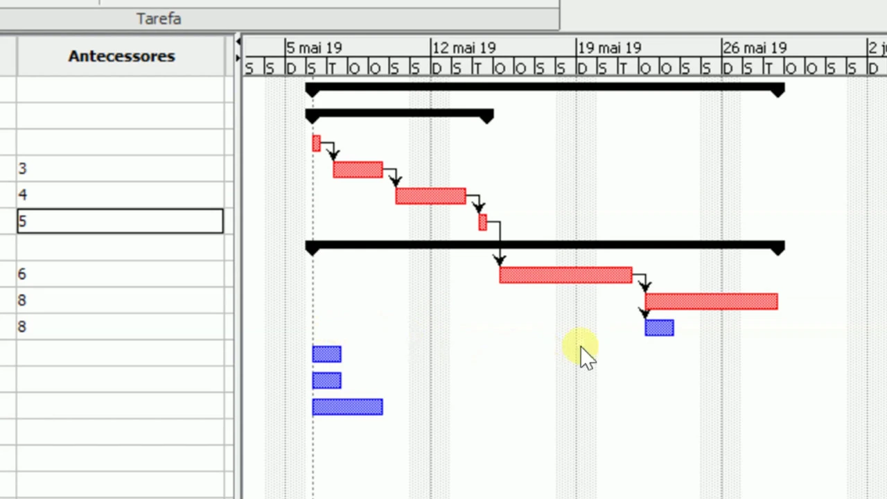 maio que é o dia que a gente tinha definido como o início do projeto bom então basicamente a gente precisa falar qual tarefa vem antes de qual ou seja quem é o antecessor de quem Existem várias formas da gente fazer isso no Project libre eu vou ensinar para vocês as duas principais então primeiro eu vou só arrastar essa barra para cá pra gente conseguir enxergar essa outra coluna antecessores então a gente poderia dizer o seguinte eh essa tarefa três brainstorming de ideias ela tem que acontecer antes dessa outra tarefa que é o detalhamento das ideias
