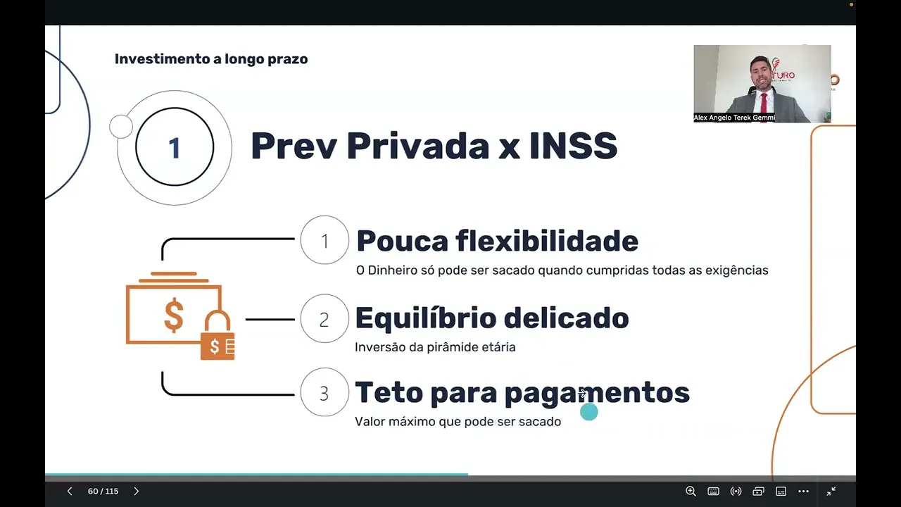 Olá parceiro futuro seja muito bem-vindo a mais uma aula do módulo planejador fala como fazer a reunião de acompanhamento ou a reunião deor a reunião do Passo número qu que é o planejamento de renda futura então acompanha Até final desse vídeo você vai entender como fazer essa reunião de uma forma muito escalável muito Próspera e aquilo que a gente falou nos últimos vídeos né principalmente como ajudar o cliente a tomar decisões é melhor que o cliente tenha um pouquinho ou tenha algo que não seja o melhor mas tenha para garantir algo futuro se o cliente não conseguir fazer o ideal ou não puder fazer o ideal Mas começar com o mínimo é o mais importante porque às vezes o cliente sabe qual é o ideal sabe quanto que é o montante ideal mas não faz nada é mais importante que você planejador ajude o cliente a tomar a decisão faça o mínimo possível comece com o ideal se possível mas senão comece com o mínimo e aí depois de um ano 2 anos se ele foros se acostumando guardar aquele pouquinho sem atrapalhar as outras áreas da vida financeira E aí você vai ajudando para que ele chegue no valor ideal Então vamos lá compartilhar aqui com vocês planejamento de renda futura lembre-se galera que toda vez que vou fazer uma reunião né de parceria seja suporte seja acompanhamento seja após momento x seja um tempo depois ajudar o cliente a complementar Esse passo que tá faltando comece sempre Relembrando para o cliente né o passo a passo que a gente viu aqui na introdução do nosso módulo siga o passo a passo para que você faça uma reunião escaláveis mal Talk V liberar os acessos do cliente faça uma retrospectiva do que avançou bom cliente a nossa reunião número três a gente avançou mais um passo então agora a gente tem cinco passos de oito Hoje a gente vai falar de um assunto importantíssimo que é no Pilar da proteção de Capital que é o que garante que vai dar certo mesmo se alguma coisa der errado né a gente vai falar do Passo número qu que é planejamento de renda futura Lembrando que aqui a gente vai garantir né a sua liberdade financeira sua independência financeira então se você não tiver todos os passos Pode ser que a gente não chegue lá então os nossos encontros né se acompanhou você contratou acompanhamento bimestral a gente vai todo o encontro acompanhando vendo como é que está o desempenho nos Passos dois nos Passos sete nos demais passos para te ajudar a completar os oito passos para aí você ir ir em direção à sua liberdade financeira Então vamos lá aproveita aqui o conteúdo que é um conteúdo riquíssimo planejamento de renda futura lembra-se que nossa última reunião a gente falou de gestão de ativos e lá na gestão de ativos a gente viu curto prazo médio prazo longo prazo e a gente concluiu como escolher o ativo ou como escolher o ingrediente certo para essa receita que a gente montou na sua vida financeira né a gente montou uma receita sua vida financeira que pro longo prazo tem que ir um valor aqui considerável você construir a sua liberdade financeira e vimos também que na hora de escolher né um ingrediente ou um ativo a gente olha e leva em consideração todos os quesitos né liquidez rentabilidade segurança risco retorno aporte mínimo e a gente viu que após 10 anos esse é o único investimento que a gente vai falar aqui que você paga apenas 10% de Imposto de Renda cliente que que você prefere pagar 15% de imposto de renda ou 10 Lógico que é muito melhor pagar menos só como a gente viu na nossa última reunião o que vale aqui é o que tiver a melhor performance porque tem alguns que são isentos mas a performance é baixa tem alguns que a gente paga bastante imposto 22,5 até 15 por exemplo só performa é alta ó quando eu falo de muito longo prazo a combinação que a gente falou quanto menos imposto melhor vamos supor você juntou 1 milhão e meio R 2 milhões de reais prefer pagar 15 ou pagar 10 é lógico pagar 10 a vai falar sobre Então como construir a sua renda futura primeira coisa quando a gente fala de planejamento de renda futura a gente leva em consideração alguns aspectos né Por exemplo investimentos de longo prazo a gente tem tem aqui os tópicos que a gente vai falar na nossa reunião de hoje previdência privada versus INSS então INSS todo desconto mensal que acontece na sua receita lá se eu não me engano é 11% ele vai direcionado para a Previdência Social tá a gente vai entender um pouco mais porque que nasceu a Previdência Social a Previdência Privada Ok modalidades a diferença entre vgbl e PGBL O que significa essas siglas tributação progressiva Regressiva o que quer dizer isso e aqui o quarto ponto bancos versus seguradoras então o que que poucos sabem Então vamos lá primeira coisa primeiro tópico aqui investimento em previdência privada versus INSS o que acontece com o INSS ele tem pouca flexibilidade o dinheiro só pode ser sacado quando cumprida todas as exigências tá a Previdência privada é totalmente diferente da INSS após 6 meses já pode sacar caso aconteça algum imprevisto caso precise porém é o investimento pensando em longo prazo para mais de 10 anos como a gente veio falando dois equilíbrio delicado o que acontece a inversão da pirâmide etária quando foi desenvolvido o cálculo da previdência social no Brasil que é o INSS tá a gente tinha 70 milhões de habitantes Uma expectativa de de vida de até 60 anos pessoas que tinham três 4 C ou mais filhos ao longo dos anos população vem crescendo muito chegou a 220 milhões de habitantes quase as pessoas querem ter um no máximo dois filhos e as pessoas estão Vivendo muito mais antigamente o cálculo de pagar um aposentado vamos supor era do 55 ao 60 ou do 60 ao 65 o hoje a expectativa de vida já passou doss 85 anos dizem que até 100 anos por isso que atualmente 2024 é um rombo de mais de 70 bilhões deais em NSS então o governo fica tirando de um lugar para cobrir