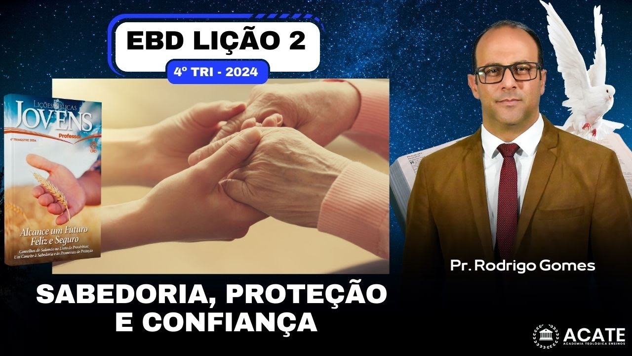 bíblicas de escola dominical gravando o quarto trimestre de 2024 da nossa Revista de jovens currículo dos jovens então estamos estudando sobre alcance um futuro feliz e seguro conselhos de Salomão no livro de provérbios um convite à sabedoria e as promessas de proteção com uma revista escrita pelo pastor Oliveira Estamos estudando essas máximas de vida que o livro de provérbios nos propõe na aula de hoje estudaremos a lição de número dois do dia 13 de outubro de 2024 o título da nossa lição é sabedoria proteção e confiança sabedoria proteção e confiança o texto principal da nossa