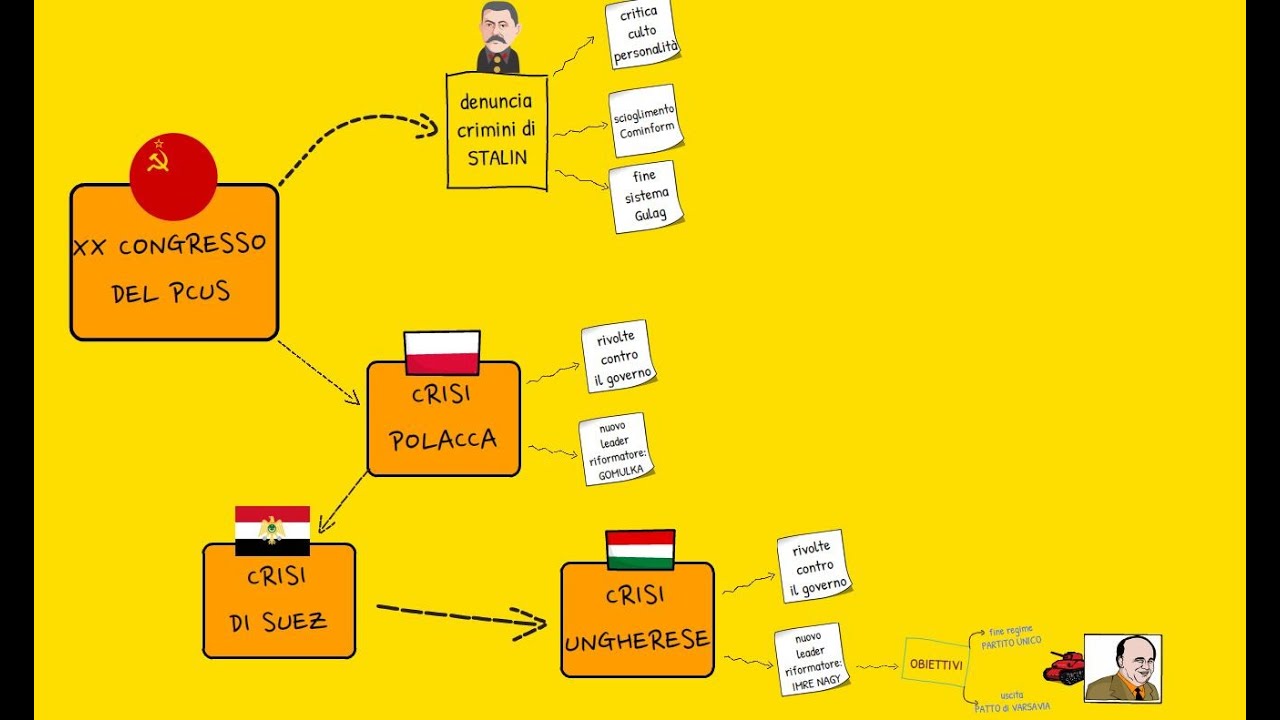 mondo sovietico nel 1953 infatti finisce la stagione staliniana con la morte del dittatore e l'avvio di una guerra intestina per la successione che porterà nel giro di un paio di anni all'ascesa di nikita krusciov il quale sostituirà la tesi del conflitto inevitabile proposto da stalin o fritte inevitabile tra capitalismo e comunismo con la tesi della coesistenza pacifica ovvero l'idea di poter creare le condizioni per una convivenza non conflittuale dei due blocchi questo percorso in realtà procederà fra alti e bassi come si vede già nei primi passaggi nel 1954 infatti ad esempio assistiamo a delle prime