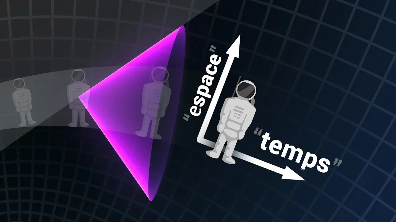 rigoureusement ce qu'on appelle le temps le temps en relativité et simplement la direction dans laquelle sont orientés les cônes de lumière c'est cette direction suivant laquelle on peut pas faire demi-tour cette direction vers laquelle. Toutes les trajectoires possibles et dans laquelle se situe forcément notre futur l'espace quant à lui est l'ensemble des autres directions perpendiculaires autant [Musique] dans une zone où l'univers est vide en l'absence de gravité sa structure l'espace-temps est régulière le temps et l'espace font une grille ordonné rectiligne et les cônes de lumières sont tous alignés dans une même direction on peut ainsi