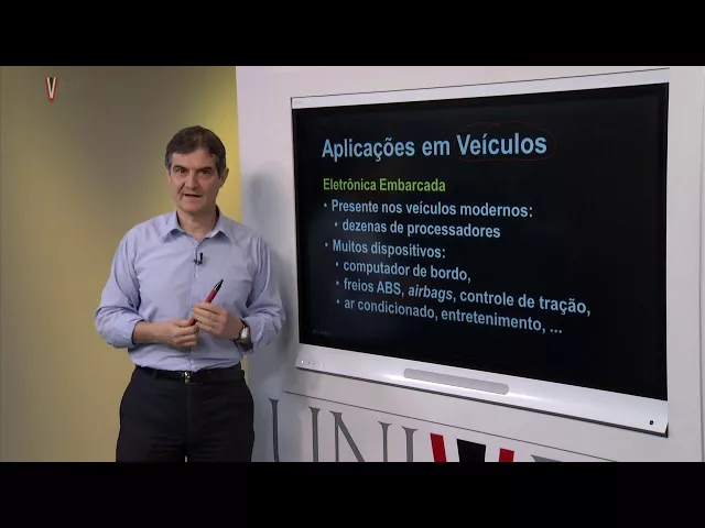é muito rico e muito presente na nossa vida para exatamente desenvolver os assuntos envolvem que envolvem eletrônica embarcada nós vamos usar muito esse exemplo nas nossas vídeo aulas ao longo da nossa disciplina que é o caso de veículos qualquer veículo hoje em dia seja popular ou não ele possui eletrônica embarcada já faz parte do seu projeto e não é exagero dizer que ele possui dezenas de processadores possui realmente uma quantidade dessa ordem de processadores espalhados em todo o veículo né então essa é eletrônica está presente em todos os veículos modernos então muitos dispositivos alguns nós