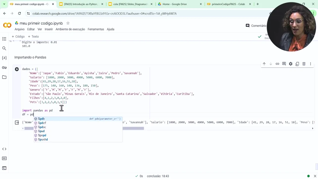 ele então eu vou colocar Import pandas S pd que é o apelido de pandas muitas vezes você vai encontrar alguns códigos prontos exatamente com essa estrutura agora eu vou criar uma outra variável que é o meu Data Frame e eu vou chamá-la de DF Então o meu DF vai ser igual pd olha aqui quem é pd é o meu pandas pandas ponto E aí eu vou trazer a estrutura do meu pandas aqui para dentro Eu chamei aqui o o control barra de espaço e aí Ele trouxe algumas informações que já estavam disponíveis aqui dentro da