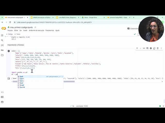 então um dos maiores e mais conhecidos quando a gente trabalha com análise de dados e ciências de dados chama-se pandas e ele não vem nativamente aqui dentro do meu Python eu preciso fazer uma importação Como já fizemos lá no começo do nosso treinamento Então você vai copiar esses dados e vai colocar esse dicionário aqui então eu vou criar um novo código e vou copiar e colar Então veja só eu criei aqui uma variável chamada dados E aí eu estou criando uma estrutura que é um dicionário Observe aqui que eu coloquei eh as chaves tá então