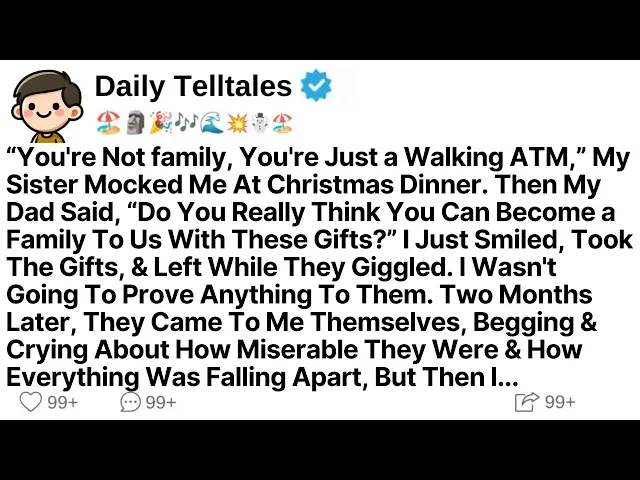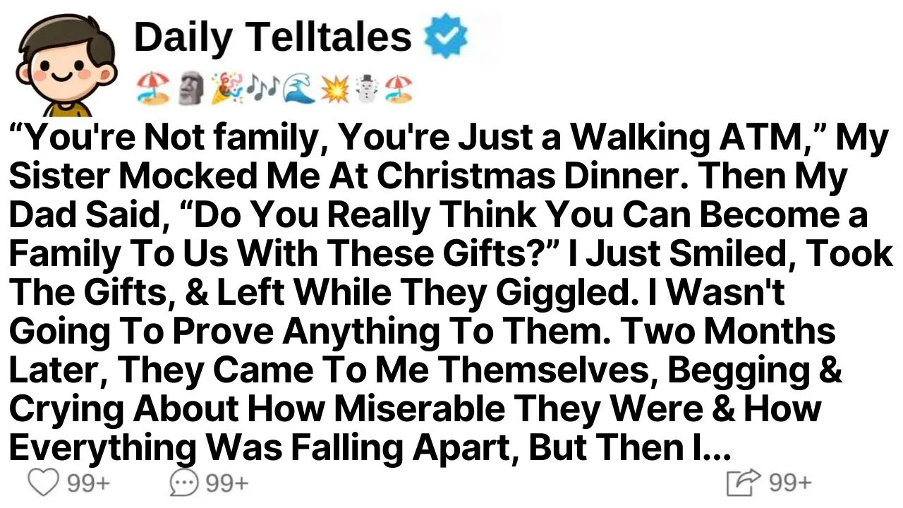 you're not family You're just a walking ATM My sister mocked me at Christmas dinner Then my dad said "Do you really think you can become a family to us with these gifts?" I just smiled took the gifts and left while they giggled I wasn't going to prove anything to them Two months later they came to me themselves begging and crying about how miserable they were and how everything was falling apart But then I growing up I always felt like a guest in my own family like I was tolerated not welcomed I thought maybe if I