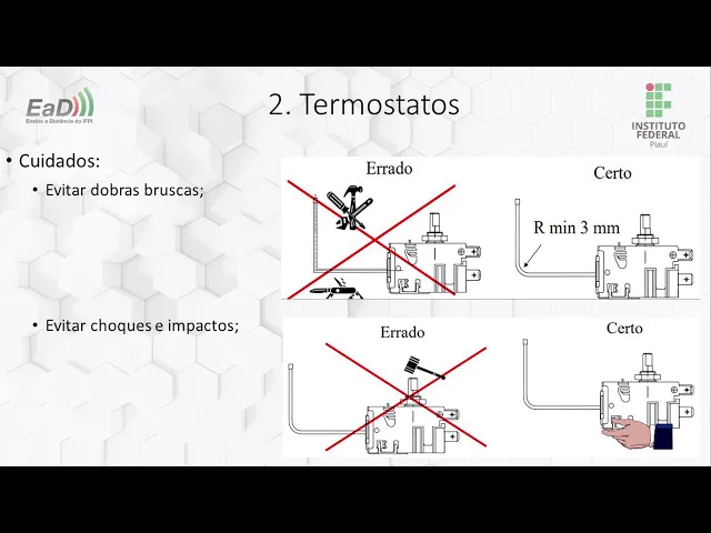 [Música] [Música] olá pessoal aqui é o processo forte né a gente continuar aqui na disciplina de automação na unidade dois cursos técnico em refrigeração do médio tech à distância nessa unidade 2 a gente vai ver um pouco sobre os dispositivos de processos de proteção é principalmente termostatos e para os estados ea gente vai ver também sobre o sistema de retorno de óleo então os preços citados e termostatos ele tem como objetivo que ligar ou desligar o sistema na maioria das vezes em função das condições tão se a pressão de descarga está muito elevada na ele