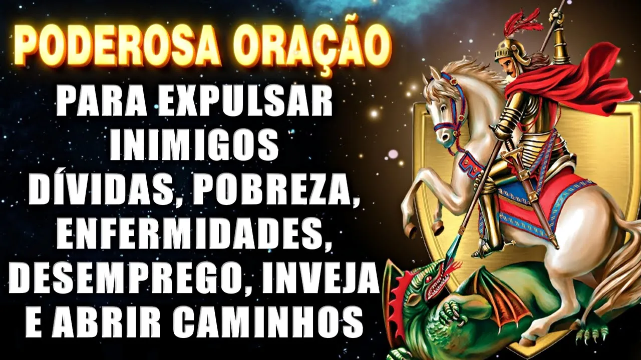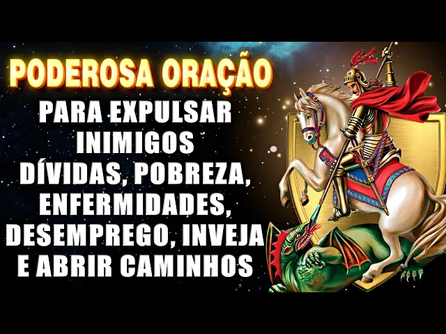 mim com tua espada afiada corta os obstáculos que impedem meu progresso E afasta de mim as energias negativas que possam me prejudicar que toda pobreza tristeza dívidas desemprego ruína enfermidade e aflição se distanciem da minha vida São Jorge santo guerreiro que triune sobre o dragão conceda-me a coragem para enfrentar meus próprios demônios internos e as batalhas diárias que tua luz ilumine meu caminho e tua proteção me envolva afastando influências negativas e atraindo bênçãos divinas em teu nome São Jorge peço que tua luz divina dissipe as trevas ao meu redor E tua presença seja um escudo