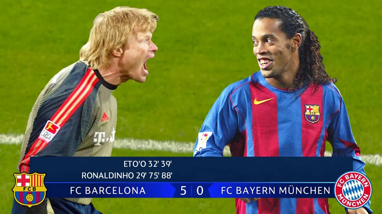 the easiest thing to do in World football and Lethal finishing skills from The Cameroon forward there 39 minutes gone and Barca have wrapped this one up already 3-0 it's only a friendly match but uh against Bayern [Applause] Munich and Deco there pushed over by S amovic and is now moved to the left Ronaldinho again again so far in this first half now Ronaldinho or Messi they swap places continually now here's Ronaldinho on the left playing the ball in short to Messi here Ronaldinho lovely control Oh What a Beautiful pass lovely skill from the Brazilian as