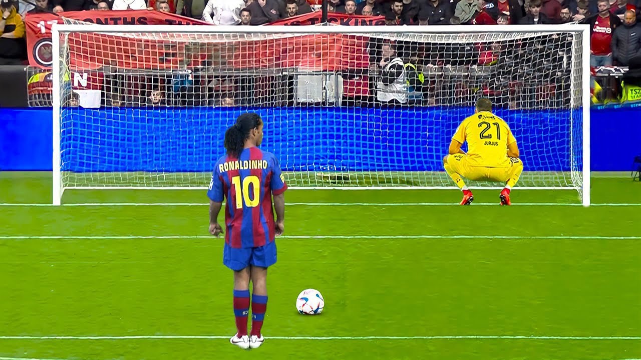 let's see who's going to take it referee blows is going to be Ronaldinho 1 nil superbly executed free kick from the Brazilian absolutely Unstoppable Oliver KH there was nothing he could do about it and I think K probably like myself was a little bit confused by the fact that M was standing over the ball it did look as though it was more set up for M and Ronaldinho curling it over and around the wall into the top right hand corner and K I think waiting for a shot from the left footer there was nothing he