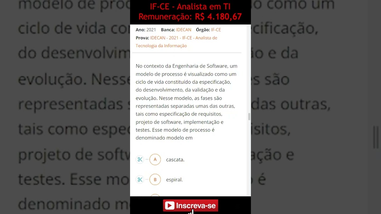 essa sequência Olá pessoal então é isso a gente vê o que algumas questões sobre modelos de processo de software se você quiser mais questões sobre esse tema Não deixe para a gente o comentário aí peça que a gente vai ter satisfação em desenvolver esse trabalho aí juntos comentando aprendendo mais resolvendo questões que se esse conteúdo foi hoje para você compartilhe com seus colegas se inscreva no canal e acompanha nosso trabalho Obrigado até a próxima gente se ver