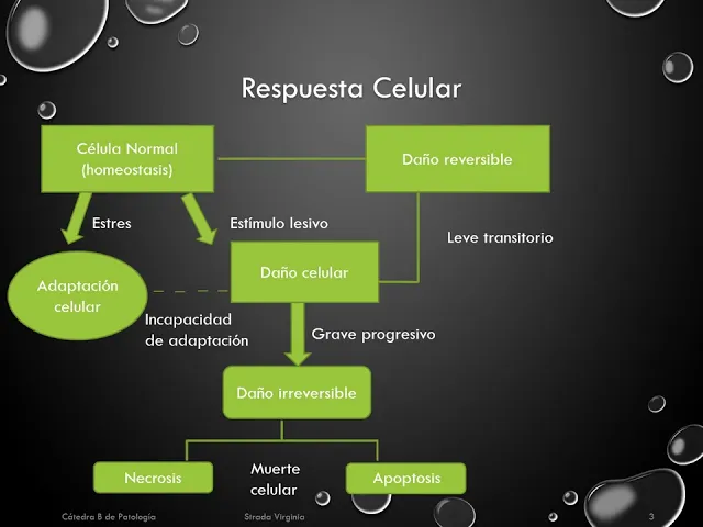 sobrevivir una célula debe ser capaz de adaptarse a condiciones ambientales adversas que vamos a ver entonces De qué manera lo puede hacer cómo puede ser la respuesta celular frente a un determinado estímulo es decir una célula normal que tiene una homeostasis entre el medio interno y el medio externo puede sufrir un estrés y poder adaptarse al mismo también es puede recibir un estímulo lesivo que la lleva a ocasionar un daño celular ese daño celular puede ser de tipo leve transitorio y ocasionar un daño reversible que le permita a la célula una vez superado el mismo