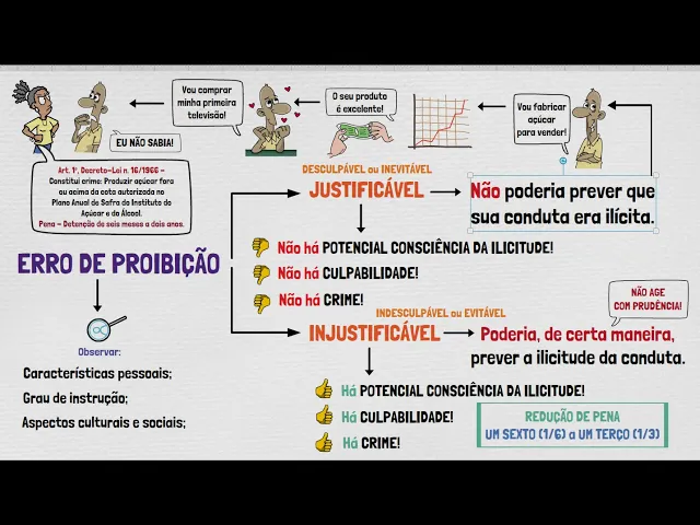 de sua conduta o erro de proibição justificável exclui a potencial consciência da ilicitude e via de consequência a culpabilidade do agente logo não há crime já o erro de proibição injustificável também denominado indesculpável ou evitável é aquele em que o agente poderia de certa maneira prever que sua conduta era dotada de ilicitude se agisse com mais prudência porém não faz neste caso não há exclusão da culpabilidade nem do crime todavia a pena do agente pode ser diminuída de 1/6 a 1 ter em verdade a linha entre o erro justificável e o erro injustificável é tênue