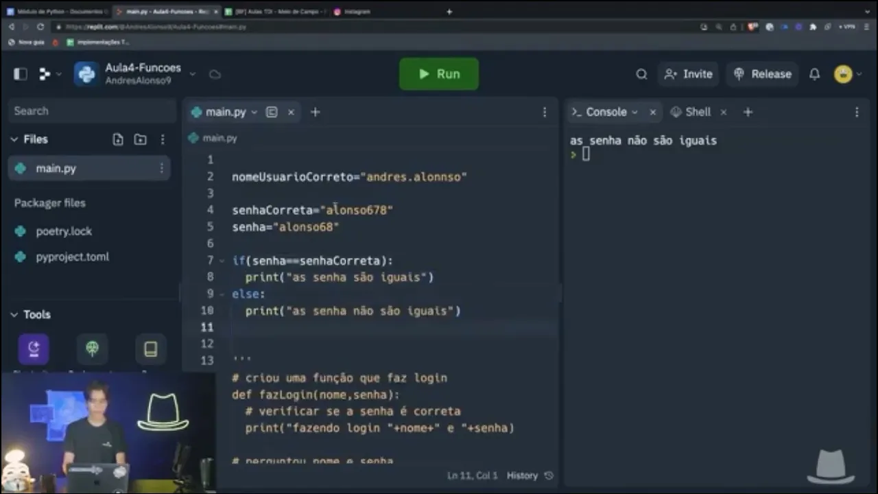 fala pessoal andreus al aqui e na última aula a gente meio que copiou o sistema de login do Instagram aqui na minha tela tem o último código que a gente fez e aqui a gente criou meio que criou uma função ontem vocês aprenderam como criar funções uma coisa essencial na programação para criar um aplicativo Complex um aplicativo grande só que a gente enfrentou problema aqui a gente tentou criar um sistema de login só que como que a gente pode verificar na nossa função no nosso sistema de login a senha o nome e a senha que