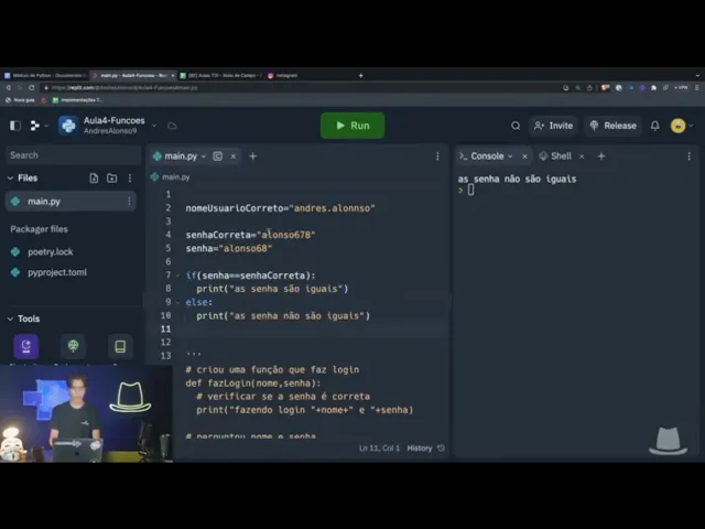 falhas em outra linguagem então também é possível aplicar isso no hack você aprendeu como verificar dois dados implementar isso no nosso sistema de login então agora a missão para você é criar esse sistema aqui é criar uma função aqui dentro e vai verificar se a senha é correta e senão ele também vai falar que a senha é incorreta e é praticamente um sistema de login aqui então perguntar o o nome e-mail perguntar então perguntar o nome e senha chamar uma função de fazer login e dentro dessa função ele vai verificar se a senha correta e