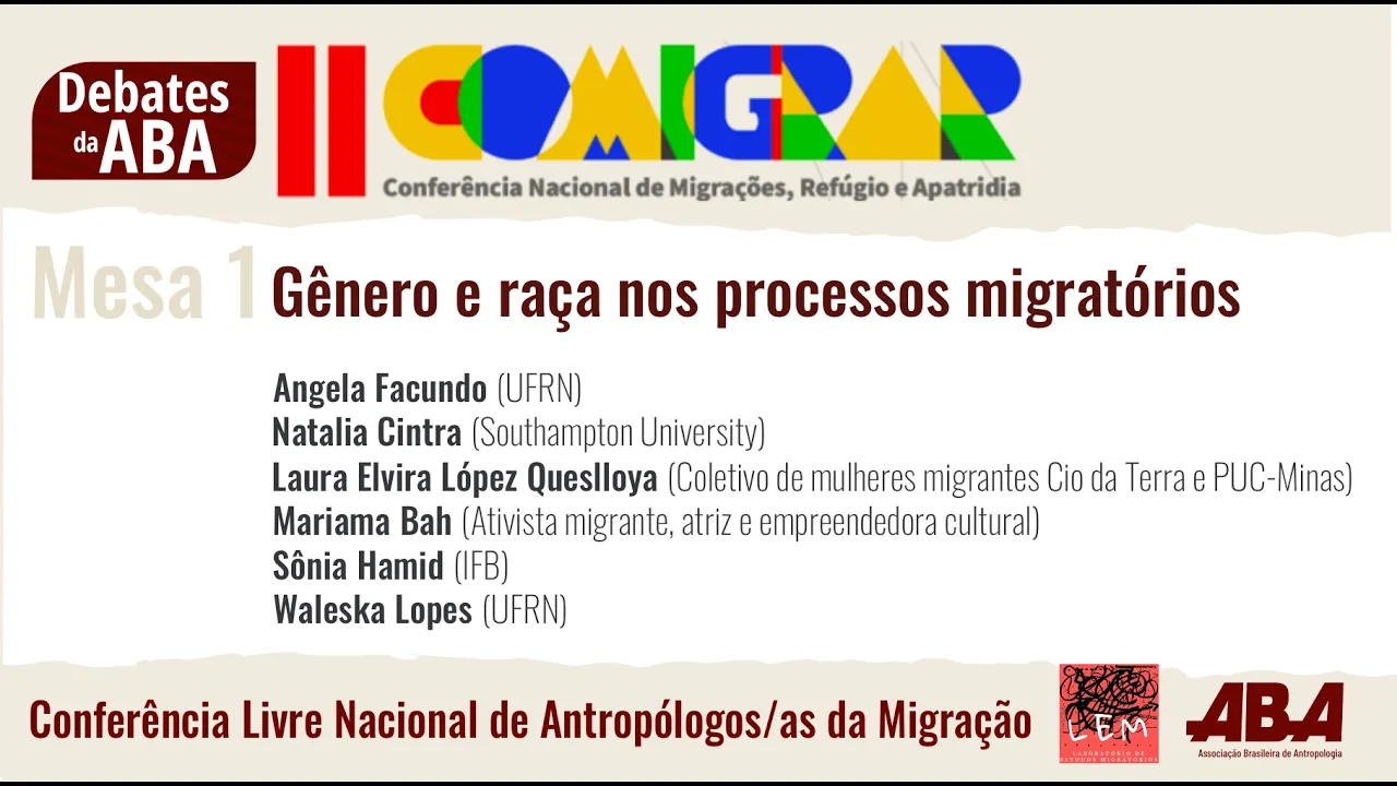 Igor Machado vão acontecer sete messas n acontecerá entre hoje e amanhã mas elas vão ser disponibilizadas depois na na TV eh eu queria comentar eh antes da gente passar a palavra para as convidadas que eh o título né que a gente decidiu refletir sobre como os processos de Gênero e raça ou racialização acontecem eh nos processos migratórios na verdade deixou de foram um monte de outras categorias que fazem parte cop substancial eh desses processos né então a gente não pode falar dessas coisas sem falar em raça sem falar em nacionalidade sem pensar na sexualidade na