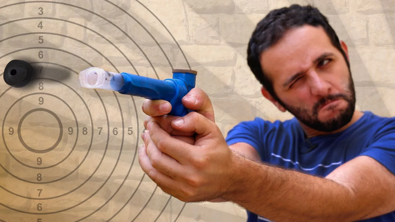 com a pistola para eu poder usar o gatilho no lugar do dedo indicador e segurar aqui com o resto da [Música] mão tive uma ideia linda quando vocês con eu acho que eles foram lá pra garagem você já olhou na garagem Eu acho que eu levei tudo para lá porque não faz sentido deixar aqueles canos aqui ocupando espaço galera me pergunta que que eu faço com Os experimentos antigos do manual do mundo é isso aqui eu uso em outros ó tem um t e dois pedacinhos de cano o diâmetro desse cano aqui é 25 mm