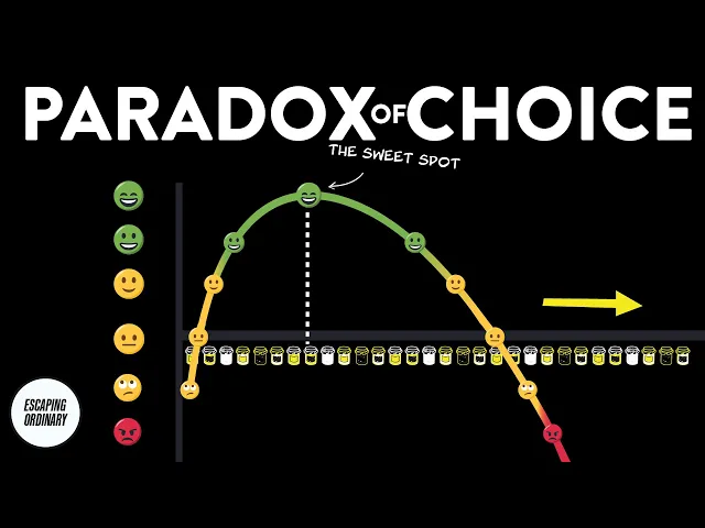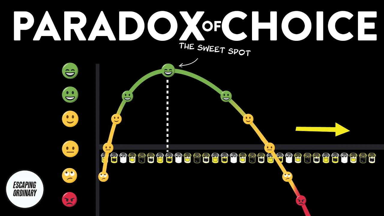 The Paradox of Choice At a supermarket, two experiments were conducted. In the first experiment, 24 different types of jam were available to freely test and buy for a discounted price. In the second experiment, only 6 different types of jam were available to freely test and buy for a discounted price.
