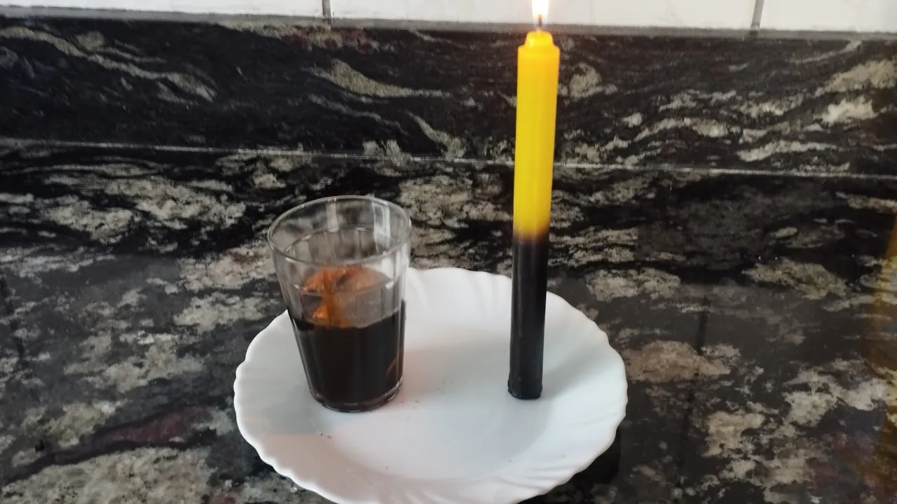 aí deixa lá queimar em cima de um uma mesa em cima de um fogão de uma pia depois que terminou de queimar a vela você pode guardar aqui essa cerveja por os três dias tá com seus pedidos dentro e depois dos três dias pode jogar ela num vasinho de planta se você tiver ou na terra e se não tiver como pode jogar na pia tá o papelzinho com os pedidos também pode amassar jogar no lixo que já recebeu ele já recebeu já cumpriu missão o restinho da vela também pode jogar no lixo tá e eu