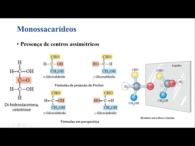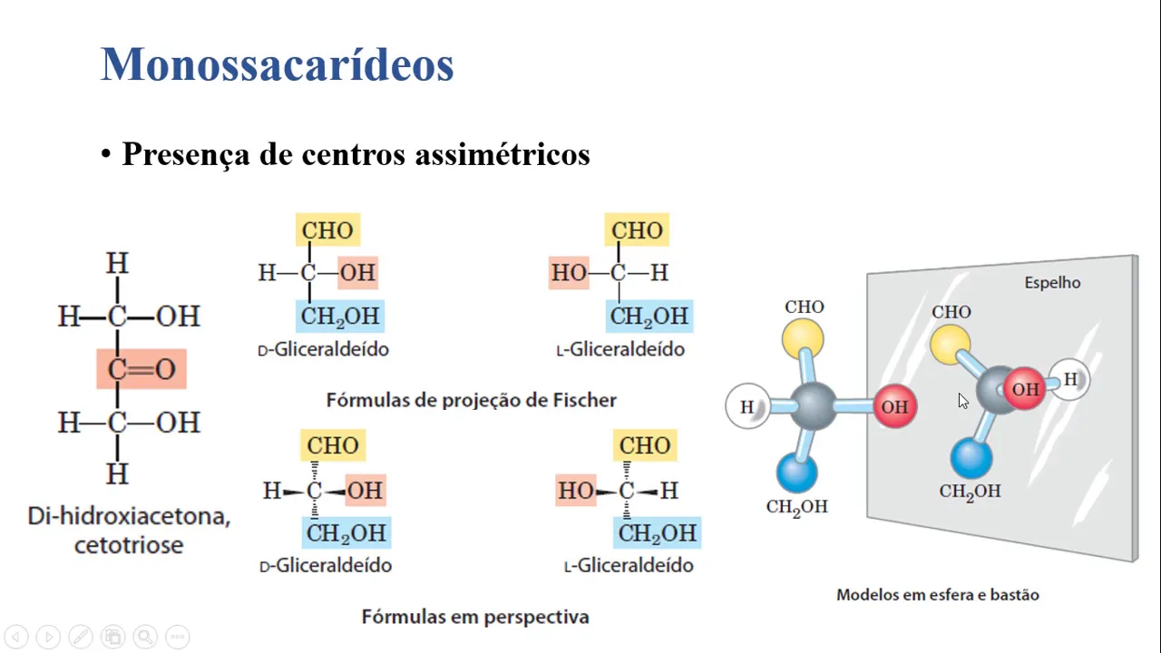 constituem os nucleotídeos que estão compostos no DNA RNA e DNA respectivamente assim como os aminoácidos os monossacarídeos eles também apresentam centros assimétricos ou seja a seguir as é claro que tem uma exceção que é um tiro hidroxiacetona que é o único monossacaride que não vai Apresentar esse carbono assimétrico justamente pela presença desse desse grupo cetona no meio da molécula o monossacarídeo mais simples no qual possui um único carbono assimétrico e portanto dois isômeros opticamente ativos é o gliceraldeído Portanto ele apresenta a sua forma de e ele justamente em relação à posição da hidroxila Lembrando que