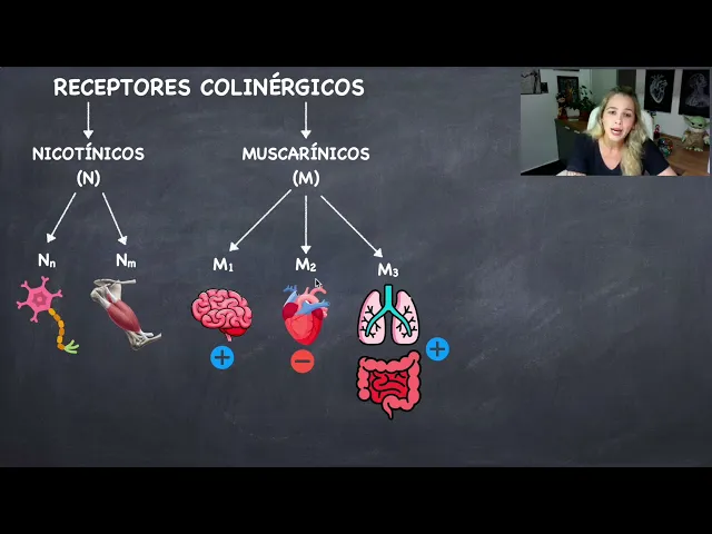 [Música] tá bom e os receptores colinérgicos gente olha só a gente vai ter dois tipos também os nicotínicos e os muscarínicos tá os nicotínicos tem dois subtipos [Música] NN que vai tá nos neurônios a gente vai ter o NM então n o enzinho minúsculo de neurônio o NM que vai est nos músculos tá então na placa motora por exemplo esse NN que vai tá naquele no neurônio ganglionar que a gente falou vai ser esse receptor que a chocolina que é liberada do Pré vai agir no pós através desse receptor os muscarínicos a gente vai ter