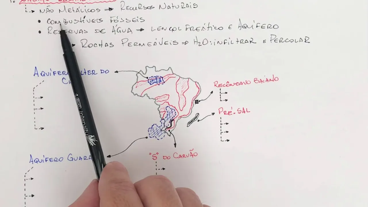 as grandes áreas de depósito sedimentar que existem no mundo consequentemente no brasil nessas bacias sedimentares nós encontraremos os recursos minerais não-metálicos a beleza que que chamamos aqui de recursos minerais não-metálicos alguns vestibulares trocam a expressão recursos minerais quando eles são não metálicos por recursos e naturais beleza então quando a gente encontra ferroluminio manganism óbvio etc dá-se o nome normalmente de recursos minerais quando nós encontramos recursos não metálicos normalmente os vestibulares trocam o nome para recursos naturais quais são os dois recursos naturais normalmente encontrados em bacias sedimentares primeiro os combustíveis fósseis oi e aí nós temos