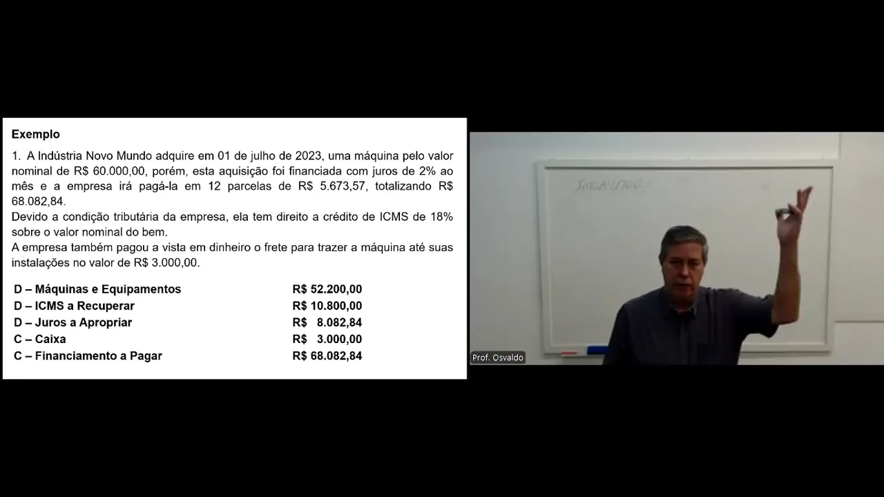 080 84 de juros que não podem entrar no custo do bem adicionalmente temos também a outra informação devido a condição tributária da empresa ela tem direito a crédito cms de 18% sobre o valor nominal do bem então ela tem 18% de cms valor de 6. 000 que ela pode recuperar é um direito dela e a empresa pagou a vista tem dinheiro o frete para trazer a máquina até as suas instalações no valor de R 3. 000 Então olha como eu vou contabilizar tá então 60.