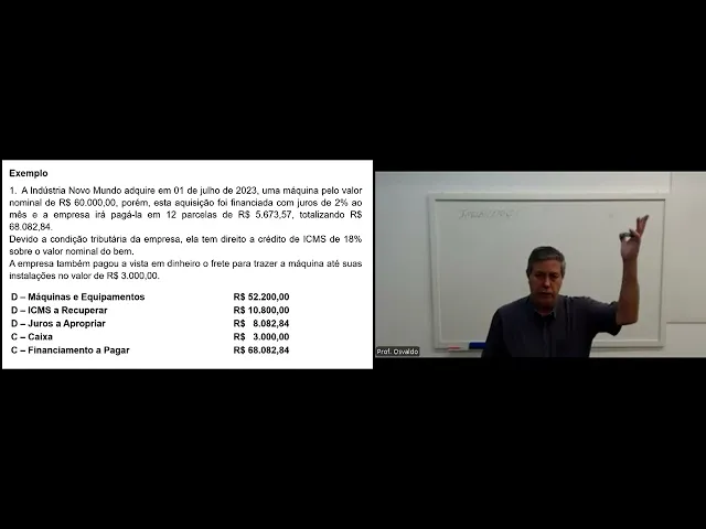 800 como ela terá um direito a recuperar Isso aí é um ativo vai lá pro ativo circulante ou não circulante os juros a apropriar aquele valor de 8. 000 não pode ser contabilizado como uma despesa é um juros que nós teremos que ir apropriando mensalmente tá então cabe aqui que montarmos uma tabela Price tá e fazendo apropriação mensal desses juros 3. 000 acreditei na conta Caixa que foi o frete pago à vista em dinheiro tá ok 3.