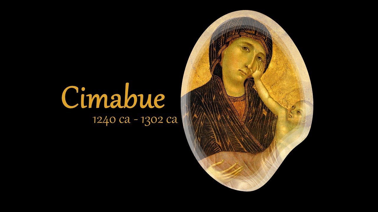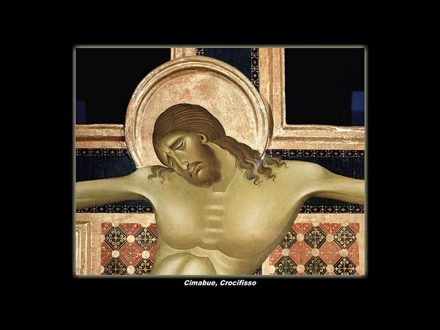 il crocifisso della chiesa di san domenico ad arezzo pur rifacendosi ancora l'iconografia romanica del christus pad yens costituisce quanto a tecnica realizzativa una straordinaria novità il corpo del cristo infatti non pende mollemente dalla croce ma sembra quasi volersene dolorosamente di staccare nell'ultimo disperato sussulto dell'agonia il disegno è estremamente nitido e incisivo e colori sono dosati con un sapiente effetto di chiaro scuro e si modellano la figura conferendole un volume è una maestosità solenni questo non significa che cimabue si sia di staccato all'improvviso da tutte le regole della tradizione la complessa geometria della croce gli occhi