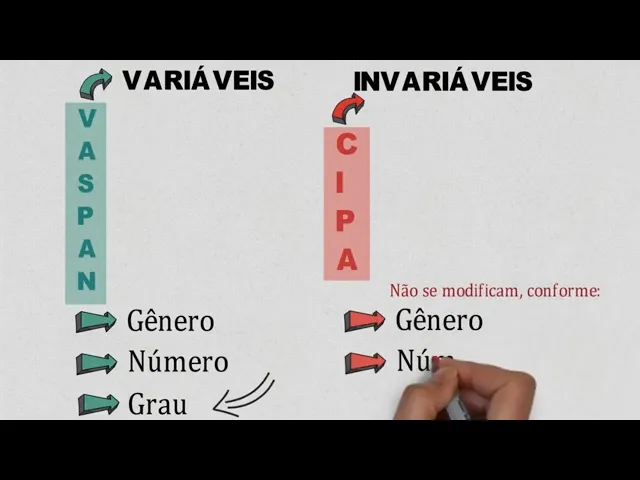 E aí Fala galera e vamos para mais uma aula do nosso curso português uma criado vamos lá ó nosso assunto de hoje será sobre classe de palavras ao Todos nós temos 10 classes de palavras e Essas palavras são divididos em variáveis e invariáveis tá os Oremos dois milhões importantes para explicar os ó o primeiro deles é muito baixo Pan o Vasco representa a classe das palavras variáveis você vai me perguntar assim professor mas o que é classe palavra variável bom eu explico para você e as variáveis só aquelas palavras que vão variar conforme gênero e