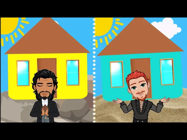 facilmente manipulável ele mal cavou e usou materiais frágeis para construir sua casa terminando rapidamente quando os dois terminaram suas casas uma nuvem escura pairou sobre a cidade anunciando a chegada de uma grande tempestade o homem sábio viu a nuvem se aproximando e ficou tranquilo pois sabia onde sua casa estava construída e poderia aguentar qualquer dificuldade o insensato ignorou qualquer aviso e pensou que sua casa era suficiente para suportar a chuva e os ventos logo a tempestade chegou e trouxe consigo fortes ventos fortes as águas dos rios transbordaram inundando a cidade a casa do sábio permanecia