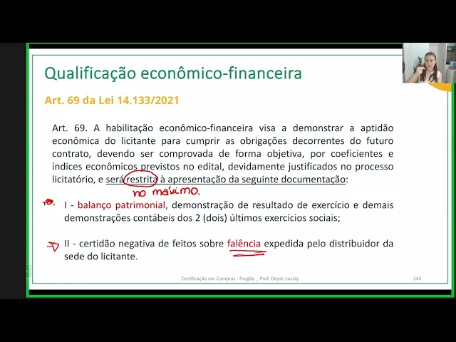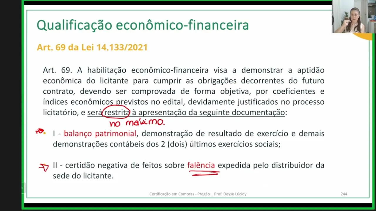 [Música] e agora vamos falar da qualificação Econômica financeira na nossa licitação o que pode ser exigido e Como avaliar vamos lá pessoal vamos aqui para o nosso material falar sobre qualificação econômico-financeira bem para isso nós vamos ler o o artigo 69 69 da lei 14.133 a nova lei de licitações olha só a habilitação econômico-financeira Visa demonstrar a aptidão econômica do licitante para cumprir as obrigações decorrentes do Futuro contrato então gente quando a gente fala em habilitação econômico e financeira eu tô falando aqui na capacidade que a empresa tem de cumprir o contrato né que a