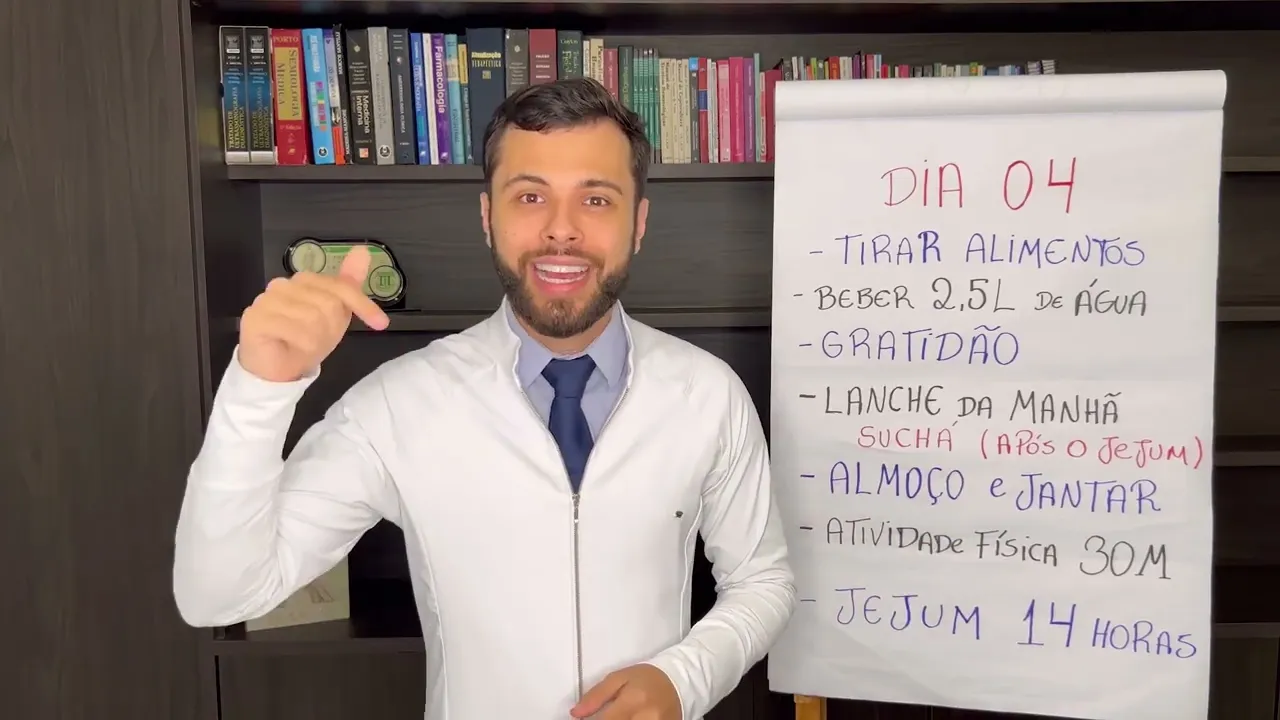 do jantar do dia anterior você pode estar repetindo nesse dia no nosso quarto dia de desafio você estará realizando uma atividade física de 30 minutos Sim essa atividade física vai evoluindo gradativamente Então você irá separar 30 minutos do seu dia para realizar uma atividade física que você gosta Lembrando que não tenha necessidade de realizar mas sempre que você conseguir você estará aumentando ainda mais os seus resultados e entre o quarto e o quinto dia de desafio nós também também estaremos realizando um jejum intermitente de 14 horas então você irá no quarto dia jantar até à